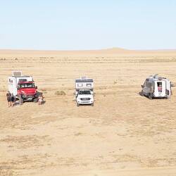 Es geht einige Stunden durch feinsten Sand. Die Autos ziehen Sandschwaden hinter sich her. Sie sind eingepudert bis zum Dach! Unsere eigentlich schwarze Treppe sieht aus wie mit Samt bezogen.