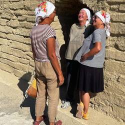 Gleich auf dem Parkplatz werden wir von Kasachen reichlich beschenkt: große Tüte Brot, große Tüte Bonbons und für jede von uns ein geblümtes Kopftuch!
