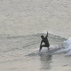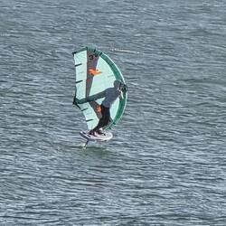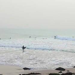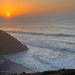 The next day wind is less but the dust remains in the air and you can hardly see the sun. We change to the Atlantic side and park on the promenade to watch wave surfers and hydro foils in the waves as the sun goes down.