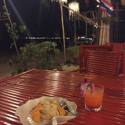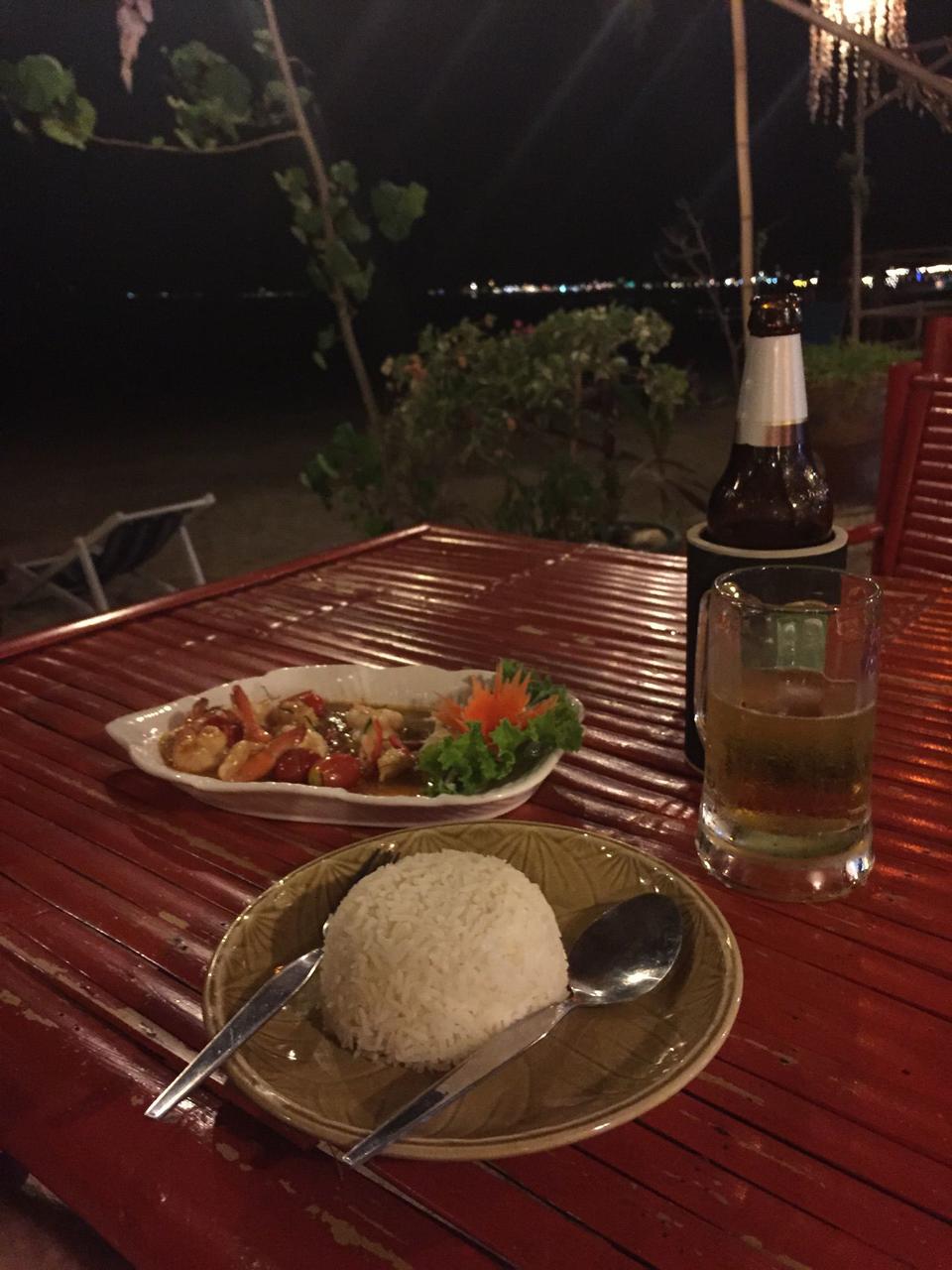 Direkt am Strand. Meerrauschen. Sand unter den Füßen. Ein kühles Singha Bier. Rotes Curry mit Prawns. Sweet Sticky Rice mit Mango. Tequila Sunrise.