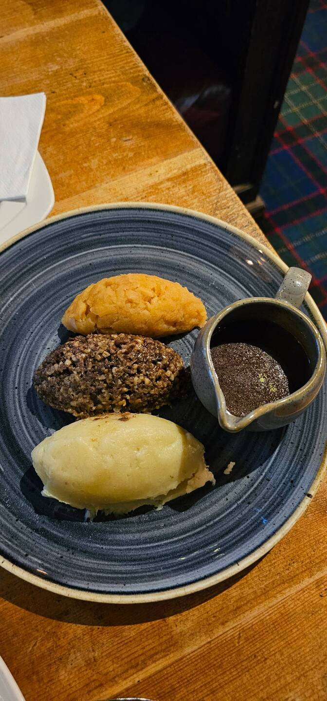 Dinner: Haggis, neeps and tatties. Stovies, and Meat pie.
