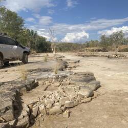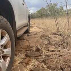 Surprise, surprise. A big downpour in the afternoon and an evening-long special effects show from lightning to the west and clear skies overhead for some star gazing. The 45 min shower was enough the deposit 10cm of water at the concrete causeway near the camp. I am trepidatious thinking of the state of the roads when all that Bull-dust starts getting wet. The dust that was already on the car soon set in a thick clay-pan. Crikey.