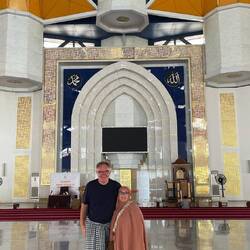 Bevor wir Makassar verliessen, besuchten wir die Moschee der 99 Türme (Masjid Kubah 99). Sie ist besonders speziell wegen ihrer Farbe orange-gelb, denn normalerweise sind Moscheen eher in blau-grün. Werni musste einen Sarong über die kurzen Hosen anziehen und Helen das Gebetsgewand für Frauen. Aber der Blick ins Innere hat sich trotzdem gelohnt. Gemäss Ikhsan ist in Indonesien alles erlaubt, nur eines auf keinen Fall: mit Schuhen/Flip-Flops in die Moschee!!! 🤣