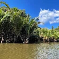 Nach der Mittagspause machten wir eine Bootsfahrt auf dem Fluss, der inzwischen beachtlich gesunken war. Der Fluss ist umrahmt von Mongroven-, Mangobäumen und Palmen.