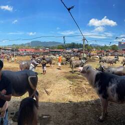 Wir besuchten den Tiermarkt, wo Büffel in verschiedenen Preisklassen und auch Schweine gekauft oder verkauft wurden. Dies passierte auf einem grossen Platz. In der Mitte wurde über den Preis verhandelt und ringsum gab es viele Leute, die das Geschehene ganz genau beobachteten. Denn wenn ein Handel nicht zustande kam, dann versuchte der Nächste sein Glück und hatte nun eventuell bessere Chancen. Die Büffel gibt es in 5 Kategorien von IDR 60 - 700 Millionen = CHF 3‘000 - 35‘000. Extrem teuer.