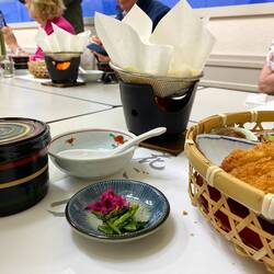 Как всегда на обед поставили горелку на этот раз в сосу поместили бумагу, в которой был традиционный набор из капусты, лапши, тофу и пара фрикаделек. Пока все это варилось, ели маленькие острые закуски и курицу в кляре, ну и конечно, рис.