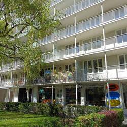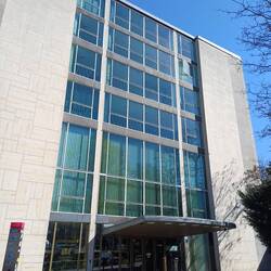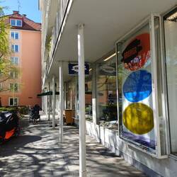Am Wohnhaus in der Theresienstraße 46-48 bin ich schon oft vorbeigefahren. Obwohl es ein Nachkriegsbau ist (1950/51), hat mir schon immer diese leichte Fassade und die zeitlose Moderne gefallen.