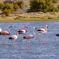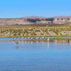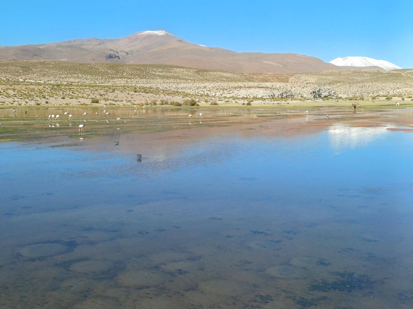 Am Morgen genießen wir noch einmal die Idylle mit Flamingos und Lamas an der Laguna.