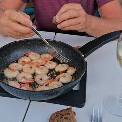 Der eine ging dann sein Abendessen mit fischen zu verdienen, der andere marschierte in den Pub und wir brutzelten Shrimps mit Zwiebeln und Knoblauch, dazu Brot und ein Glas Weisswein.