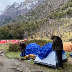 Le soir on se régale d'une purée goût quatre fromages et saucisses au dîner pour se remettre de nos efforts dans un cozina remplie de trekkeur dont beaucoup d'anglais et quelques français. La nuit le vent se lève et, en bon débutants, on a mis nos tentes dans la clairière au lieu de la forêt, offertes aux rafales sur un plateau. Ça souffle tellement qu'elles manquent d'arracher les tentes plus d'une fois.Read more