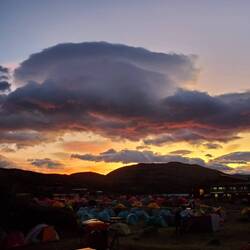 Le paysage est toujours aussi incroyable et parcourir le chemin en sens inverse nous fait découvrir de nouveaux points de vue. Arrivée à 18h au campement/refuge - Paina Grande, après 3h30 de marche. Pile à temps pour observer un superbe couché de soleil avec en fond les tentes de toutes les couleurs, le lac, et la montagne, c'est vraiment beau. On mange une fois de plus un repas à base de saucisses purée et c'est toujours aussi bon même si il s'agirait d'arrêter d'écrire 4 portions sur des paquets qui sont en fait pour 2 (selon nous en tout cas). Ça sera dodo à 22h comme des enfants histoire d'être en forme pour la suite ! 🥰
