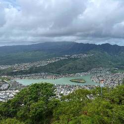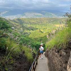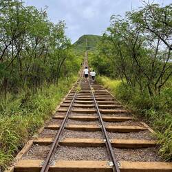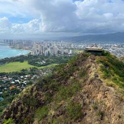 Anschließend ging es noch zum Koko Head zum Koko Crater Railway Trailhead. Ich hatte zwar zuvor glesen, dass es sehr anstrengend sein soll und habe den Weg dennoch komplett unterschätzt. Der Weg führte auf Zuggleisen und unendlich wirkenden Treppen den ehemaligen Vulkan hinauf. Obwohl ich insgesamt dafür ca nur 40 Minuten brauchte war ich wirklich am Limit. So ging es mir das letzte Mal als ich den Waynapicchu, mit Blick auf den Machhu Picchu, hinaufwanderte. Gefühlt hatten alle schon ihre Shirts ausgezogen und schwitzten komplett. Überraschenderweise gingen Viele den Weg. Aber Viele blieben auch oft an der Seite der Stufen sitzen. Ich kämpfte mich hinauf und wurde mit einem atemberaubenden Ausblick oben belohnt 😍 Außerdem sah ich oben einen Mongoose, ein Tier das aus Indien in den 1880ern zur Rattenbekämpfung eingeführt wurde. Man hätte auch theoretisch rüber auf Maui und Molokai, weitere Inseln Hawaiis, schauen können, aber dafür war es zu bewölkt.