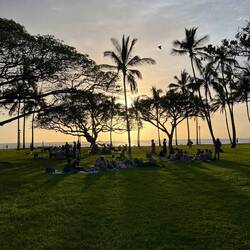 entfernt im Meer 😃 Wale kann man mit Glück auch sehen, aber das blieb mir dann doch verwehrt. Oben an der Spitze wurde die militärische Nutzung des Kraters während des Kalten Krieges erklärt. Ich sah auch einige weitere Vögel, wie den ‚Cardinal‘ und wunderschöne Blumen, die hier endemisch sind. Vom Diamonds Head ging ich dann zu Fuß zurück nach Waikiki. Das war dann doch viel schneller als auf den nächsten Bus zu warten. Dort erlebte ich dann Schüler:innen für eine Parade probten und ein Fußballspiel. Der Tag endete mit einem Sonnenuntergang am Waikiki Beach 🥰