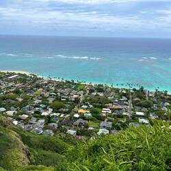 Dann ging es für uns weiter zum Lanikei Pillbox Hike. Zunächst ging es durch steiles und unwegiges Gelände bergauf. Man merkte, dass es zuvor intensiv geregnet haben musste, weil die Erde etwas instabil wirkte. Teilweise musste man auch etwas klettern, aber es waren sogar Familien mit ihren kleinen Kindern in Crocs unterwegs. Ich bin froh, dass ich zumindest meine Halbwanderschuhe anhatte. Oben angekommen bot sich uns wirklich eine atemberaubende schöne Aussicht 😍 Das Meer erstrahlte vor uns in den schönsten Blautönen und man konnte hinter uns die Berge sehen. Der Weg führte auch durch eine wunderschöne Vegetation, ich war wirklich vollends begeistert, so machte Wandern wirklich Spaß! 😃