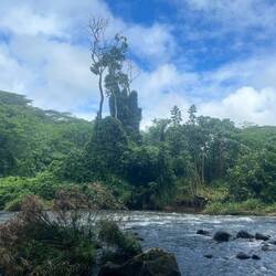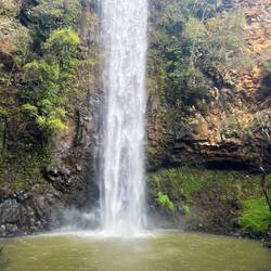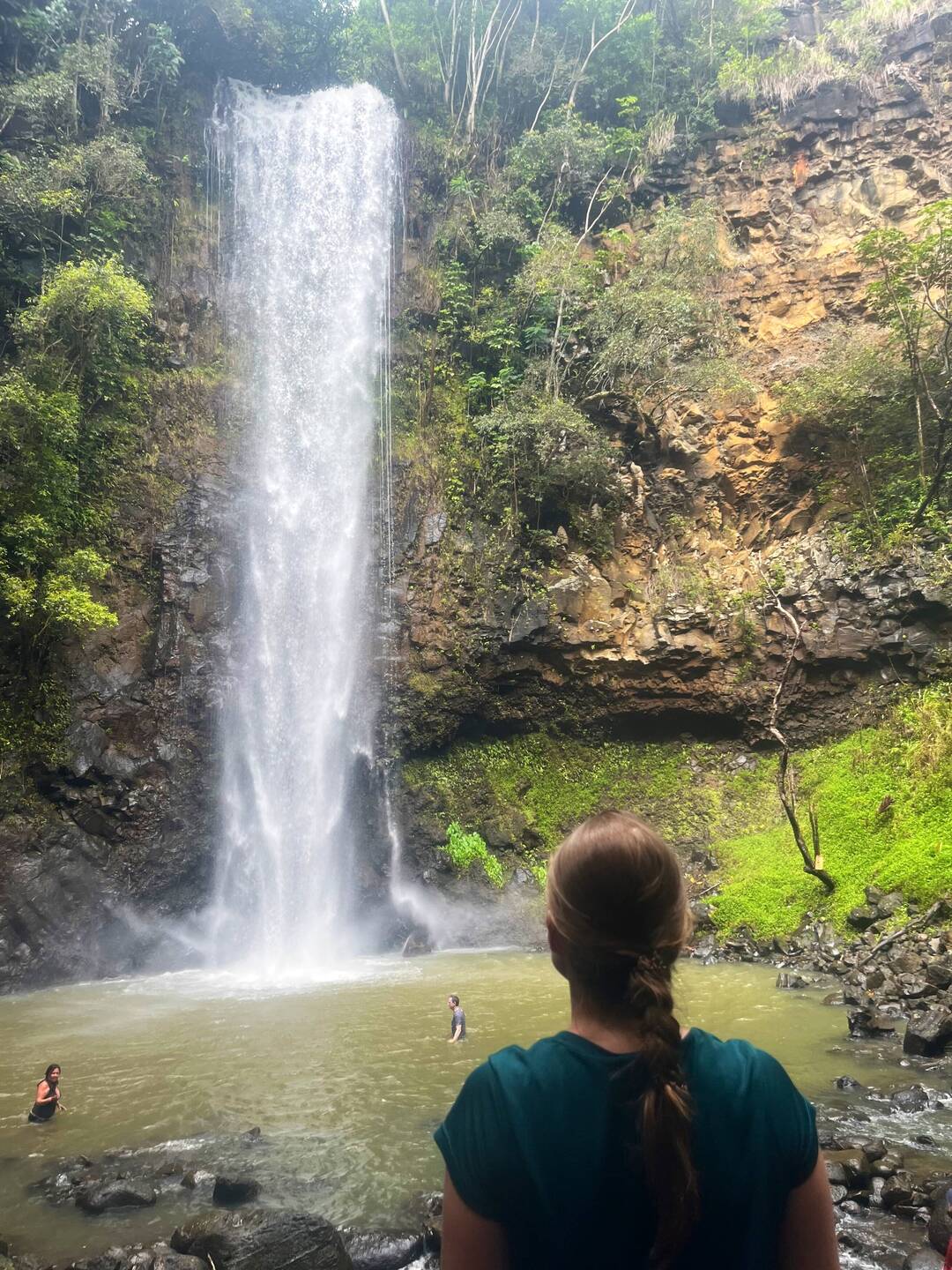Nach noch einer weiteren Flussüberquerung mit einem Seil zum Anhalten hatten wir es bis zum Wasserfall geschafft. Nach dem letzten Mal, wo ich knapp davor im Haena State Park gescheitert war, freute ich mich voll, dass es sich nun so gut ausgegangen ist und ich dieses Mal den Wasserfall sehen konnte. Durch den Regen merkte man wie viel Kraft der Wasserfall entfalten konnte. Einige Mutige gingen dennoch dort baden. Mich schaute das aber gar nicht an. 😆 Dann gönnten wir uns eine kurze Pause, wo Marie mir netterweise für unseren Ausflug gekaufte Kekse anbot. Dann hieß es: schnell wieder zurück, damit ich meinen Flug locker erwische.