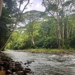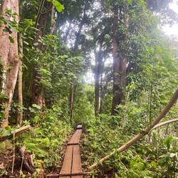 Es regnete auch immer leicht dazwischen, aber das war zum Glück aushaltbar. Der Weg führte dann am Fluss entlang. Man musste wieder zwei Mal einen Fluss überqueren, das Wasser ging dieses Mal bis zu den Oberschenkeln. Mit den Sandalen war das aber gut zu bewältigen. Marie hatte zwar ihre Wanderschuhe mitgenommen, nach der Flussüberquerung aber w.o. gegeben und ging gleich barfuß los. Gegen Ende des Weges konnte man zum Glück an einem längeren Holzsteg entlang gehen.