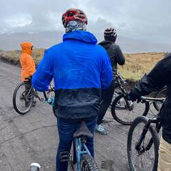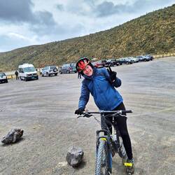 Dann war in der Tour noch eine kleine Mountain Biking Tour inkludiert. Claudia wollte aufgrund der Wetterbedingen verständlicherweise nicht mehr fahren. Ich war auch nicht sonderlich motiviert, setzte mich aber dennoch aufs Fahrrad. Es war wirklich extrem kalt und sehr unlustig zum Fahren. Ich bin auch extra langsam gefahren, weil ich dem Untergrund nicht ganz getraut habe (viele Steine & Co). Alle Anderen hatten mich schon längst überholt und ich dümpelte als Allerletzte mitten im Nirgendwo daher. Zum Glück war der Weg nicht kompliziert. An der Lagune angekommen, konnten wir leider weiterhin keinen Blick auf den Vulkan erhaschen. Das fand ich wirklich voll schade.