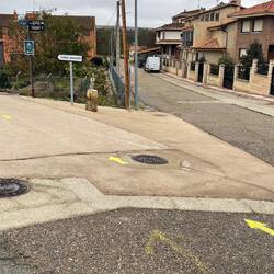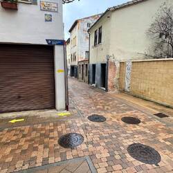 Es gab in dieser Herberge leider keinen zugänglichen Gemeinschaftsraum, was sehr blöd war, da ich nirgendwo so richtig Licht hatte. Habe mich vor so 3 Automaten gesetzt und dort meine Tasche gepackt. Ich hätte auch in die Küche gehen können, aber das Licht von dort wäre im ganzen Schlafsaal sichtbar gewesen und das wollte ich nicht. Um ca. 5 Uhr war ich dann bereit zum Loslaufen. Es wurden schwere Gewitterschauer vorhergesagt, also war ich darauf vorbereitet, ordentlich nass zu werden. Das ging vorerst leider in die Hose (später mehr dazu). Denn die Tür war einfach abgeschlossen und ich bin nicht rausgekommen. Dann hieß es also noch warten. Um 6 Uhr ist dann der Mitarbeiter gekommen, der mir gestern um 22:30 Uhr noch aufgemacht hat. Was haben die bitte für Arbeitszeiten? Naja, jedenfalls bin ich dann um kurz nach 6 losgelaufen zu der ersten Tour. Das Tolle in einer Stadt ist, dass man sich quasi nicht verlaufen kann, da alles ausgeschildert ist. Falls du dich fragst woher ich den richtigen Weg überhaupt kenne habe ich mal ein paar Fotos gemacht. Meistens ist es ein aufgesprayter gelber Pfeil in die richtige Richtung. Es gibt aber auch so Wegsteine und Schilder. In Städten gibt es die Wegmarkierungen auf dem Fußweg wie auf dem Video hoffentlich zu sehen. Dumm nur, wenn es dunkel ist und man nichts sieht. Denn ein gelber Pfeil ist im Dunkeln natürlich unsichtbar. Darum bin ich ab und zu etwas wild durch die Gegend geigelt und hab länger gebraucht als nötig, bis ich Pamplona verlassen habe. Kaum war ich aus der Stadt raus, waren natürlich auch alle künstlichen Lichtquellen weg und es war stockdunkel. Passend dazu hat es richtig, richtig heftig angefangen zu regnen. 🌧️