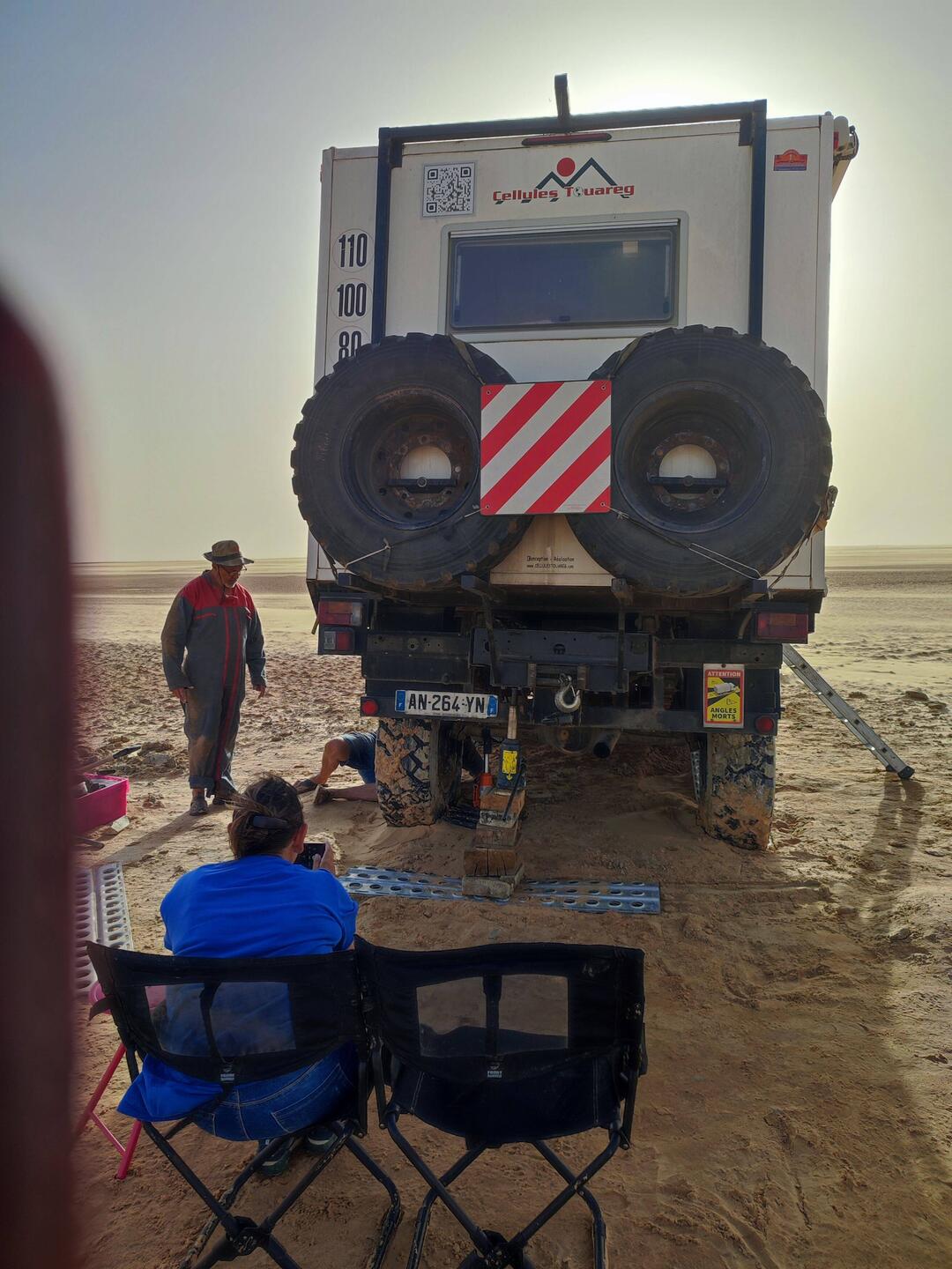 Une équipe des "garagistes -guides"est venue desenvaser le 4×4 qui s'était planté comme un néophyte,ce qui avait provoqué l'affolement de Sylvie et le déclenchement de l'alerte grand stressLæs mere