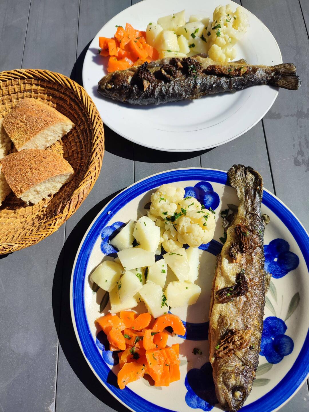 A déjeuner, truites aux morilles (cuisinées par la grand-mère)