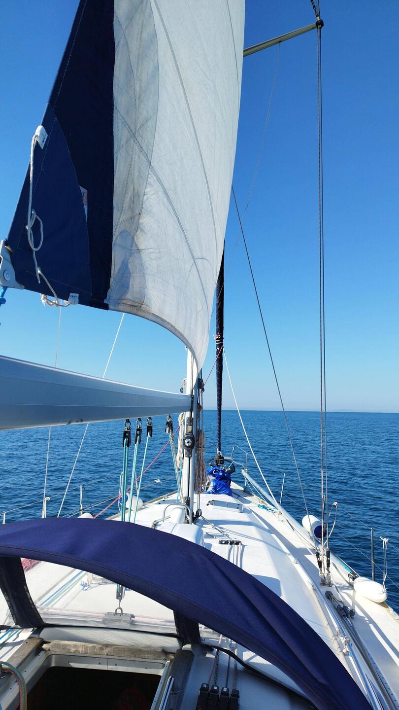 Stamattina c'è poco vento e ci toccherà fare la trasferta a motore tenendo aperta la randa che ci aiuta un pochino. Ci aspettano circa 10 ore di viaggio con mare calmo e tanto sole 😎