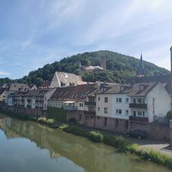 Ich passiere das schöne Städtchen Gemünden und erreiche Karlstadt, mindestens ebenso schön, aber mit einer Königlich-Bayerischen Gendarmerie-Station (immer noch Polizeigebäude) und einem schwarzen mumifizierten Hai im Ratssaal. 500 Jahre soll es her sein, als der Hai "dank eines Hochwassers" in die Kirche St. Andreas gelangte und lebend nie wieder hinaus... Auf dem "Main-Mäuerle" sitzen schon die ersten Genießer mit ihrem Franken-Wein Schoppen und werfen bei ihren innigen Gesprächen vielleicht auch ab und zu einen Blick auf den unter ihnen dahinfließenden Main oder hinauf zur Burgruine von Karlstadt.