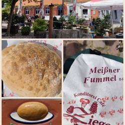 Wir bringen ihn nicht heil nach Kötzschenbroda. Dafür lass ich mir die Eierschecke (eine Art Käsekuchen) schmecken...ich hätte allerdings auch ne Butterbemme (ein Butterbrot) nehmen können und genieße den Blick auf dieses schnuckelige Städtchen.