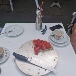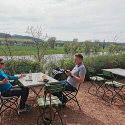 Nur eins erleben wir nicht. Geöffnete Biergärten. 40 Kilometer mit "heute geschlossen", "heute Ruhetag", "wegen Renovierung geschlossen", "ab 15 Uhr geöffnet"... es ist zum Verzweifeln. und als es dann endlich soweit ist, gibt's nur noch zwei Stückchen Kuchen vom vergangenen Wochenende. Aber egal, die Rhabarberschorle schmeckt und natürlich kommt danach ein geöffneter Biergarten nach dem anderen...