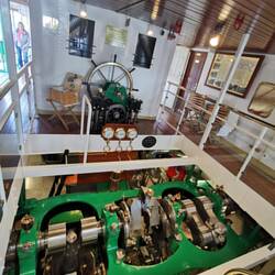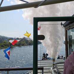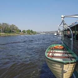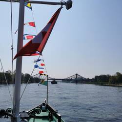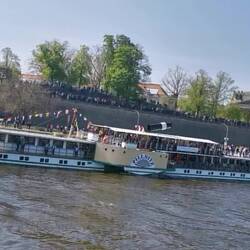 Heute muss ich dann früh raus, die Flottenparade der Weißen Flotte findet seit drei Jahren das erste Mal wieder statt. Und ich bin dabei! Mein Dampfschiff , der Schaufelraddamper "Stadt Wehlen", ist einer der ältesten Personendampfer Europas und fährt sei 1879 auf der Oberelbe. Er wird, wie auch die meisten der am Kai liegenden Schiffe, tatsächlich noch von einer Dampfmaschine (man kann sie im Schiffsinneren bewundern) angetrieben und auch das Schaufelrad ist keine Attrappe. Bei Brückendurchfahrten wird der Schornstein einfach eingeklappt.