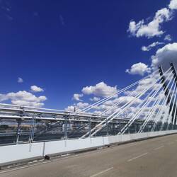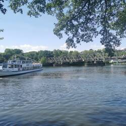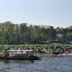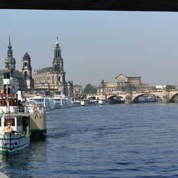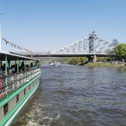 Pünktlich um 10 Uhr legt die Flotte (mit Livemusik auf jedem Schiff) nach und nach ab und in einer langen Parade fahren wir an Elbschlössern und am "Blauen Wunder" vorbei (die 1891 errichtete stählerne Loschwitzer Brücke erhielt wegen ihres hellblauen Anstrichs ihren Namen) - aber auch an der "Waldschlösschenbrücke", wegen der Dresden im Juni 2009 von der Liste der Weltkulturerbstätten gestrichen wurde (auch die besonders schützenwerte kleine Hufeisennase und eine 200 Jahre alte Rotbuche hielten den Bau nicht auf...jetzt gibt es dort beide nicht mehr...).