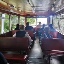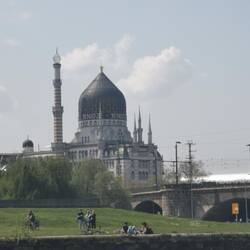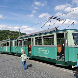 Klaus berichtet aber genauso interessant über das Schloss Pillnitz (schenkte August der Starke seiner Mätresse Gräfin von Cosel und nahm es ihr auch wieder weg), in der eine 226 Jahre alte Kamelie gehegt und gepflegt wird. Dann macht er mich auf den am Elbhang liegenden Luisenhof, ein Ausflugslokal direkt an der Bergbahn, aufmerksam. "Dort gibt es Transitenshows.."