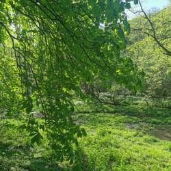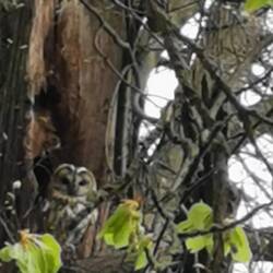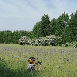 Weiter geht's durch eine nun wieder schöne, leicht hügelige Landschaft immer an der Mulde entlang. Überall duftet es nach blühenden Obstbäumen, Wiesenblumen und Raps. So gelange ich wieder einmal in eine Auenlandschaft, in der ich fasziniert anhalte. Es ist soooo schön, das helle Frühlingsgrün der Bäume und Gräser, der Kuckuck, der ruft, die Sonne, die ihren Weg in den Laubwald findet. "Ich weiß, wo ein Waldkauz zu sehen ist", höre ich da eine Stimme. Hinter mir steht ein Mann mit seinem uralten Fahrrad. Auf dem Kopf eine Kappe, die schon seinem Urgroßvater gehört haben könnte, und im Korb einen geöffneten Klappspaten. Auf dem Weg zum Kauz zeigt er mir einen Silberreiher, Schwäne, das blaublühende altlantische Hasenglöckchen und erzählt mir über die Überschwemmungen der Mulde im Katastrophenjahr 2002. Immer weiter geht es in den Wald und dann plötzlich: "Da ist er!" Ich brauche schon ein wenig, um ihn in den Baumwipfeln zu finden, aber um so faszinierter bin ich, als ich ihn entdecke. Was für ein Geschenk wird mir gemacht!