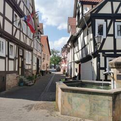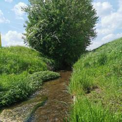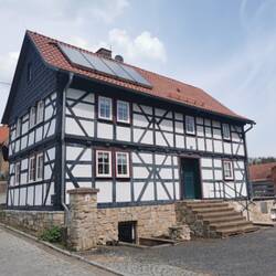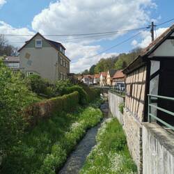 Tja, und dann verpasse ich meine Route, die "Thüringer Städtekette". Erst viel zu spät merke ich es, eine Rückkehr nach Gera ist einfach zu weit. Aber immer weiter an der Bundesstraße ohne Fahrradweg will ich auch nicht. Also die nächste Möglichkeit rechts ab...und 2 Kilometer mit 13 % Steigung geschoben. Meine letzten Müsliriegel und meine letzten Kräfte gehen dabei drauf, aber ich werde belohnt. Ich fahre danach durch kleine beschauliche Dörfchen mit Wasserkanälen, wunderschönen Fachwerkbauten und kleinen Straßen.