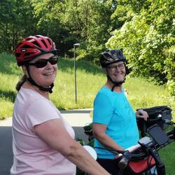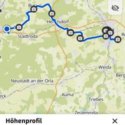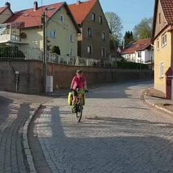 Die Wolken der Regennacht sind verzogen und ich starte mit erstaunlich gut erholten Beinen in Richtung Gera. Kaum bin ich ein paar Meter gefahren, überholt mich sehr zügig eine ältere Frau, stoppt und ich habe für die nächsten Kilometer eine sehr nette Begleitung. "Schade", meint sie, "dass wir uns nicht gestern begegnet sind. Ein Sofa hätten wir auf jeden Fall gehabt. Wäre bestimmt ein toller Abend geworden."