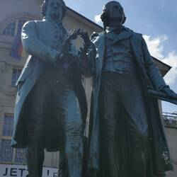 Und er traf Friedrich Schiller, der auch in Weimar wohnte und arbeitete. Zwischen beiden entstand eine enge Freundschaft, die bis zu Schillers Tod hielt. Er soll ermordet worden sein und Goethe soll als Freimauerer von der geplanten Ermordung Schillers gewusst und ihn nicht gewarnt haben...Wahrheit?-Lüge? -Man wird es wohl nie herausbekommen. Aber ein gemeinsames Denkmal haben sie. Sie stehen Seite an Seite auf dem Weimarer Theaterplatz.