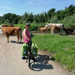 Plötzlich kommen wir nicht mehr weiter. Große Augen blicken uns an und weichen keinen Schritt zur Seite. Und wirklich Mut haben wir auch nicht...was also machen? Wir warten einfach mal und beobachten so halb relaxt ein Schlauchboot mit Managern zwecks Teambilding. Sie kämpfen sich durch...und wir auch. Allerdings mithilfe eines mutigen Radfahrers. Er klopft der "Liesel" auf den Hintern..und die Rinderherde lässt uns tatsächlich durch.
