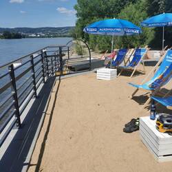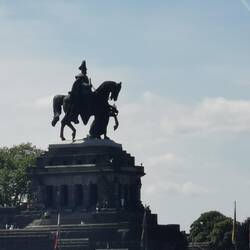 Nach einer Pause in einer herrlichen Strandbar erreiche ich das "Deutsche Eck" (erhielt seinen Namen von den dort ehemals lebenden "Rittern des Deutschen Ordens") in Koblenz . Da ich rechtsrheinisch fahre, ist der Zusammenfluss von Mosel und Rhein nicht zu übersehen ...und auch nicht der überdimensionierte Kaiser Wilhelm I., der darüber wachend auf seinem Pferd sitzt. Das Standbild wurde ihm post mortem als Ehrbezeugung zur "vollendeten Einigung Deutschlands" erbaut. Ein Relikt alter Heldenverehrungen...