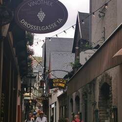 Jetzt bin ich in der Weinseligkeit angekommen. Rüdesheim am Rhein, die Stadt im Rheingau, die Stadt des Rieslings. Dank meiner Zimmerwirtin lande ich nicht in der Drosselgasse (Weinlokal an Weinlokal in einer zwei Meter breiten und 144 m langen Kopfsteinpflaststraße mit jährlich angeblich drei Millionen Besuchern) sondern in der Strausswirtschaft der Familie Philipp eine Straße weiter. Sooo schön ist es hier. Ich habe die Wahl zwischen Limburger Käs mit Musik, Spundekäs, Käsescheiterhaufen oder "Grüne Soße" mit Ei und Kartoffeln (für die ich mich entscheide) und lausche den Erzählungen der Wirtin. Mindestens 75 % der Weinanbaufläche des Rheingaus gehören demnach dem Riesling. Die verschiedenen Böden der Weinberge (Kiesel, Quarzit, Mergelböden, Löss, Schiefer und Sandstein) in Kombination mit den warmen Sommern und den milden Wintern lassen einen hervorragenden Wein entstehen... was ich nur bestätigen kann (ich bestelle gleich 24 Flaschen...).