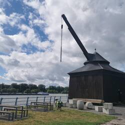 Zum Glück gut erhalten ist der Oestricher Kran aus dem Jahr 1744, ein Hebe- und Verladekran für die Weinkisten und -fässer, die ihren Weg in die Welt finden sollten. Der Kranmeister kassierte das "Krangeld" und überwachte die Arbeiten...für die Jungs in den im inneren des Krans befindlichen Laufrädern war es verdammt harte und gefährliche Arbeit. Ein bis zwei "Kranknechte" pro Laufrad. Rutschte einer aus, war es meist mit beiden vorbei, da die schwere Last beim Hochziehen nicht arretiert werden konnte. Die Laufräder wirbelten durcheinander und man hatte keine Chance, ihnen zu entkommen.