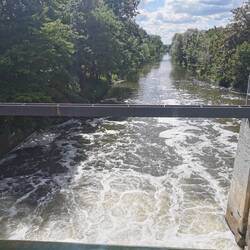 In dieser Stimmung radel ich weiter, bis ich den weit sichtbaren Turm des KZ Buchenwald erblicke. Er wurde von der DDR Regierung bereits 1954 als Mahnmal errichtet. Da werde ich von einem alten Mann auf seinem E-Bike angesprochen. Ein nettes Gespräch entwickelt sich. Er erzählt von seinen vielen Radreisen an den Flüssen unserer Republik und gibt mir den einen oder anderen Tipp. Dann zeigt er auf auf Buchenwald (ich habe beschlossen, es auf meiner Reise nicht erneut zu besuchen) und spricht plötzlich von Politik. "Die Ukrainer sind alle verkappte Nazis..was interessiert es uns, was die Russen da machen...der Scholz und seine Vasallen drücken uns ihre Meinung auf, ziehen uns in einen Krieg....das Volk hat hier nichts mehr zu sagen...wir brauchen eine humane Diktatur.."