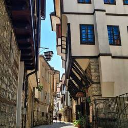 Ein Teil der Häuser in Ohrid ist in einem traditionellen architektonischem Stil erbaut, in welcher ein Gebäude drei Stufen umfasst, wobei die jeweils höhere Etage breiter gebaut wird, als die darunterliegende.