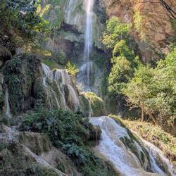 Die Wasserfälle bestehen aus kalkhaltigem Gestein, das über Jahrtausende Terrassen und kleine Becken geformt hat, in denen das Wasser glitzert.