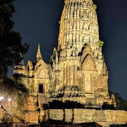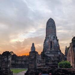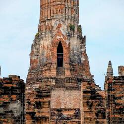 Die Stadt war im 14. Jahrhundert die Hauptstadt des siamesischen Reichs und damals eine der grössten Metropolen der Welt. Heute stehen nur noch die Ruinen, aber sie wirken immer noch gewaltig, vor allem die vielen Prang Türmchen und riesigen Buddhafiguren, die oft schief, gebrochen oder halb im Boden verschwunden sind, weil die Stadt im 18. Jahrhundert vom birmanischen Heer zerlegt wurde.