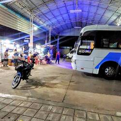 Nach einer erholsamen Nacht stapften wir durch einen sandigen Trampelpfad zum Busbahnhof, um von dort aus den 09:30 Bus nach Pakse zu nehmen. 🚐