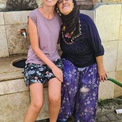 Beim Wassertanken an einem Dorfbrunnen trafen wir eine ältere Dame an, die Chantal grossmütterlich tätschelte und umarmte, wobei sie immer lachte, nur leider auf dem Foto nicht. 😄
