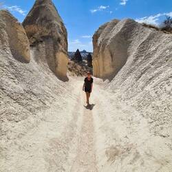 Wir entschieden uns spontan zu den Feenkaminen zu wandern anstatt mit dem Womo hinzufahren. So liefen wir über Stock und Stein, Hügel hoch und Hügel runter, aus dem Tal heraus. Der Weg war weder präpariert, noch gekennzeichnet und so liefen wir mehr als einmal dem falschen Pfad entlang und mussten feststellen, dass dies eine Sackgasse war.
