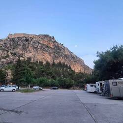 In der wunderschönen Stadt Nafplio übernachteten wir vier Nächte unter Pinienbäumen auf einem Parkplatz in der Nähe des Strandes. 🌳