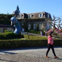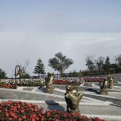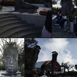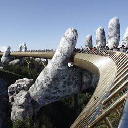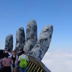 Hier Eindrücke von der Tour nach BaNa Hills. Nach der 15 min. Fahrt mit einer der modernsten Seilbahn der Welt ist der erste Stopp die Goldene Brücke, von 2 riesigen Händen "getragen". Und einLue lisää
