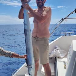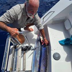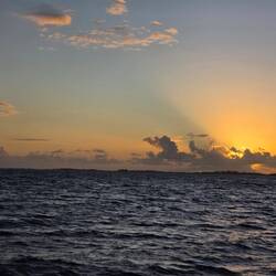Départ de Huahine à 19 h pour les Tuamotu. 200 milles nautiques. 34 h de mer. Destination première: Tikehau. Pêche de 2 thons (15 et 10 kg).
