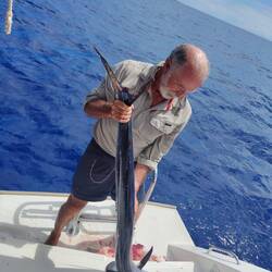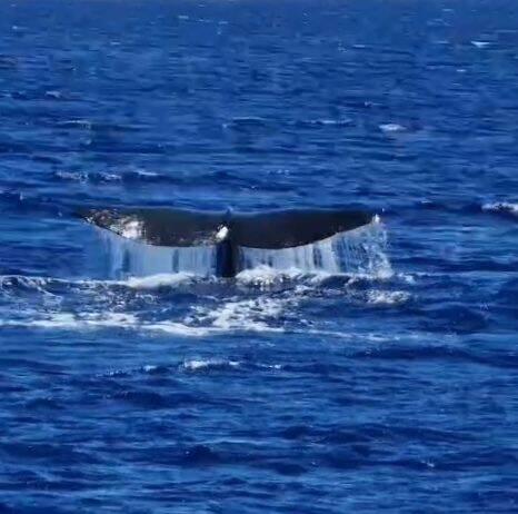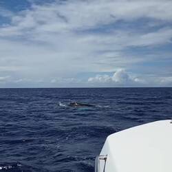 Bien secoué dans la passe de Tiputa. Dauphins. Pêche d'un marlin bleu de plus de 25 kg. Baleine, baleineau et cachalot sont restés 1/2 h autour du bateau, à 1/2 mn de Anse Amyo.